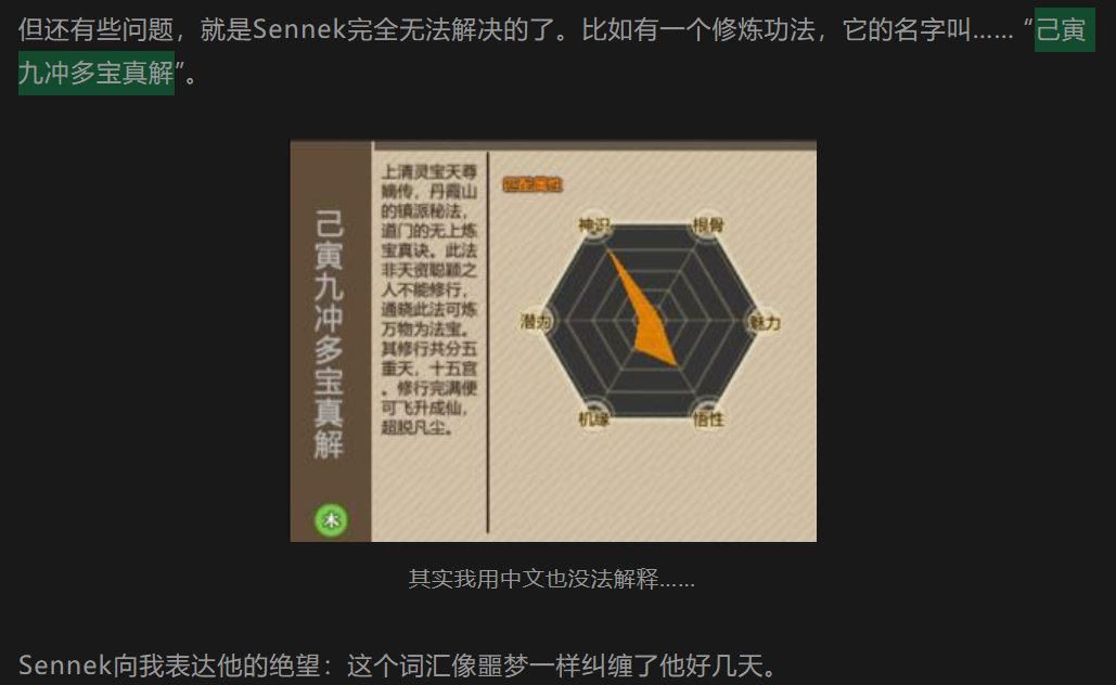 前几年,游研社写过一篇文章,说他们找到了一群靠着字典和翻译硬啃《了不起的修仙模拟器》的海外玩家,还采访到了群里的“翻译大佬”,但翻译大佬也是有局限的,当他碰到“己寅九冲多宝真解”这种词时,也得上演“完型崩溃”。