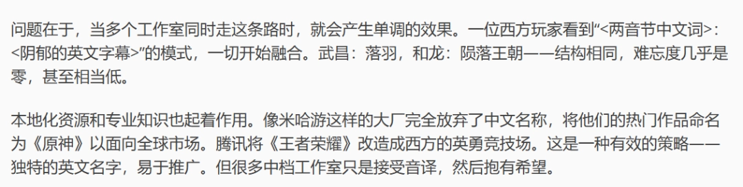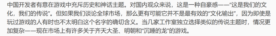 他理解使用这些词背后的文化诉求,甚至还提到了审核因素和市场因素带来的影响,认为我们的玩家会天然欢迎创作者在游戏中大量地使用中国文化元素。但他认为这一切有些操之过急,现在这个阶段把这些都端上桌,并不能让玩家们有什么样的深刻印象。
