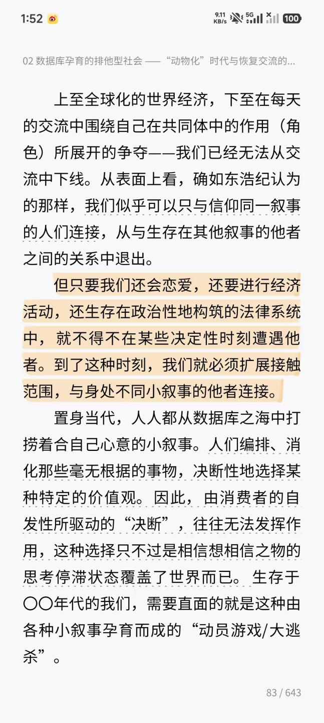 他说,互联网社会下,大家都在信息流里片段式地截取自己想要获得的信息,根据这些信息所构成的“小叙事”,来只与相近的人类相互连接、彼此抱团。在过去的一些评论家看来,这种状态可以让每个人都封闭地生存下去。