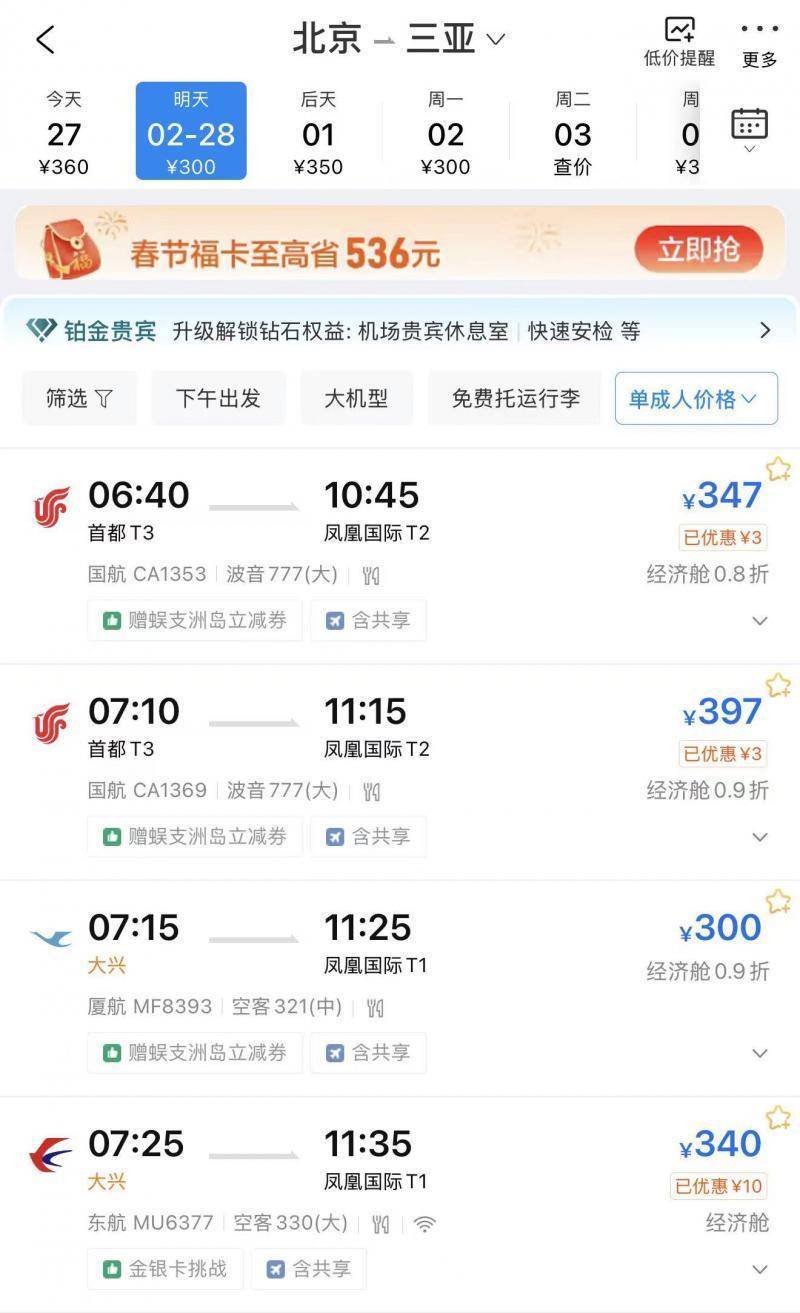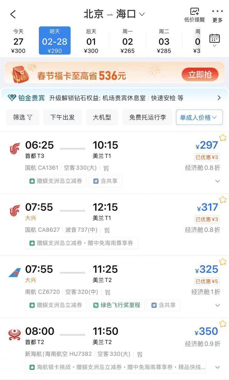 机票价格大幅回落,与春节前后潮汐式客流密切相关。以海南为例,春运以来,海南三大机场旅客吞吐量屡创新高,单日超10万人次入岛,累计15天旅客量突破20万人次,火爆客流一度推高返程票价。一边是返程票紧张,一边是进岛机票跌至低谷。北京飞三亚最低320元,广州飞三亚最低239元,多条航线低至0.8—1折。