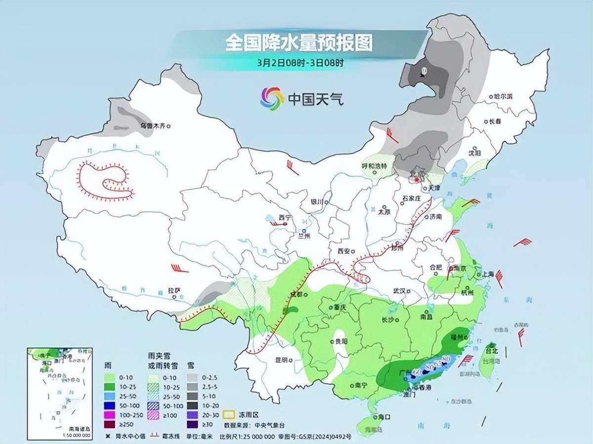 3月2日,内蒙古东部、东北地区西部、新疆北部、西藏东北部、华北北部、川西高原等地部分地区有小到中雪或雨夹雪,内蒙古东北部等地部分地区有大雪;福建中南部、广东大部、广西东部、台湾岛北部等地部分地区有中到大雨,福建东南部、广东中东部等地局部地区有暴雨。