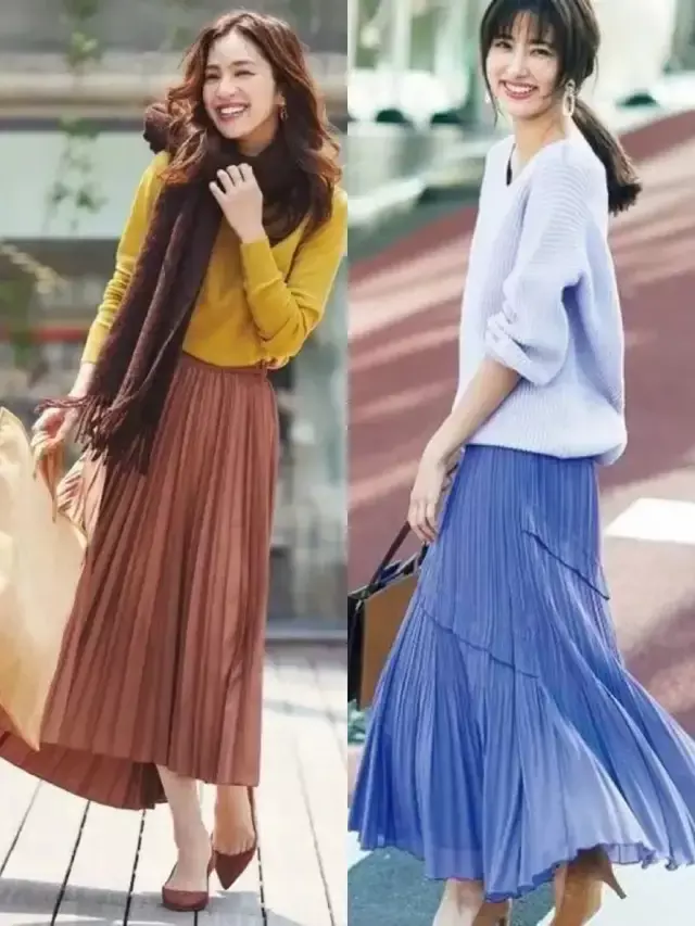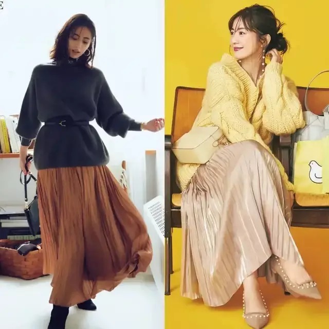 春日穿它,想要别致又有氛围感,鹅黄色针织毛衣最是吸睛,搭配大地色百褶伞裙,脚踩一双同色系的浅口高跟单鞋,温暖明亮,优雅大气。