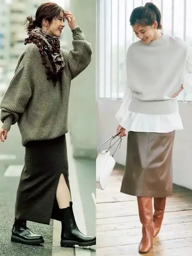 或是穿着一件微宽松的毛衣,搭配上灰色的直筒开叉半裙,脚上穿了一双黑色马丁靴,这样的搭配有一种慵懒随性的温柔气息。