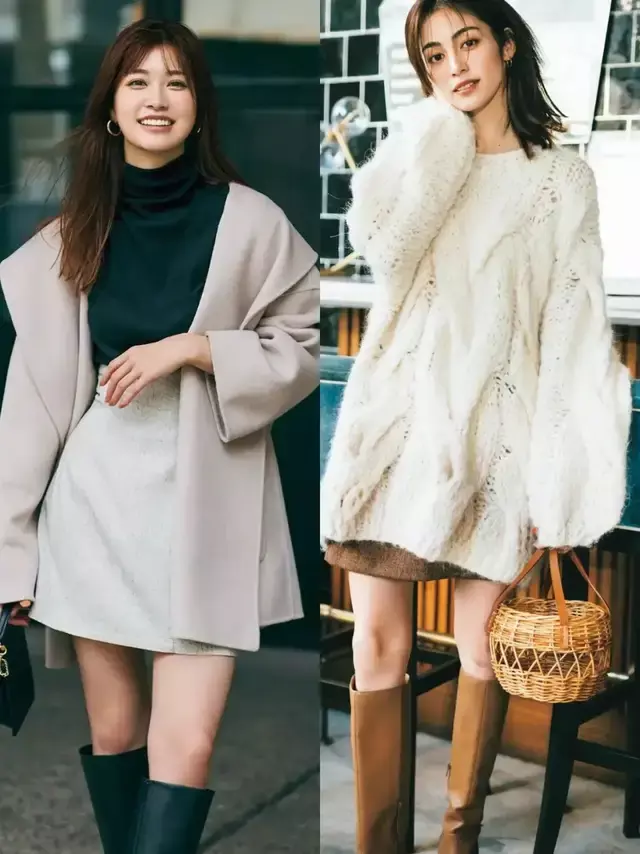 白色长款毛衣配大地色系短裙,脚踩同色系的中筒靴,温柔慵懒,自在随性。春风拂过,皆是温柔。