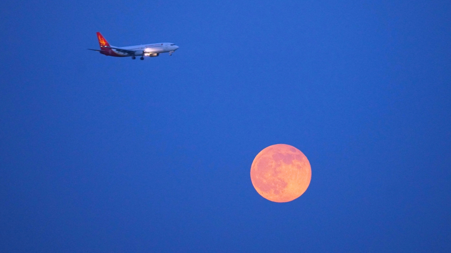 10月7日,在浙江省温州市龙湾区上空,一架飞机与月亮相映成趣。“十五的月亮十六圆”,2025年中秋月亮最圆时刻发生在10月7日11时48分。| 新华社发