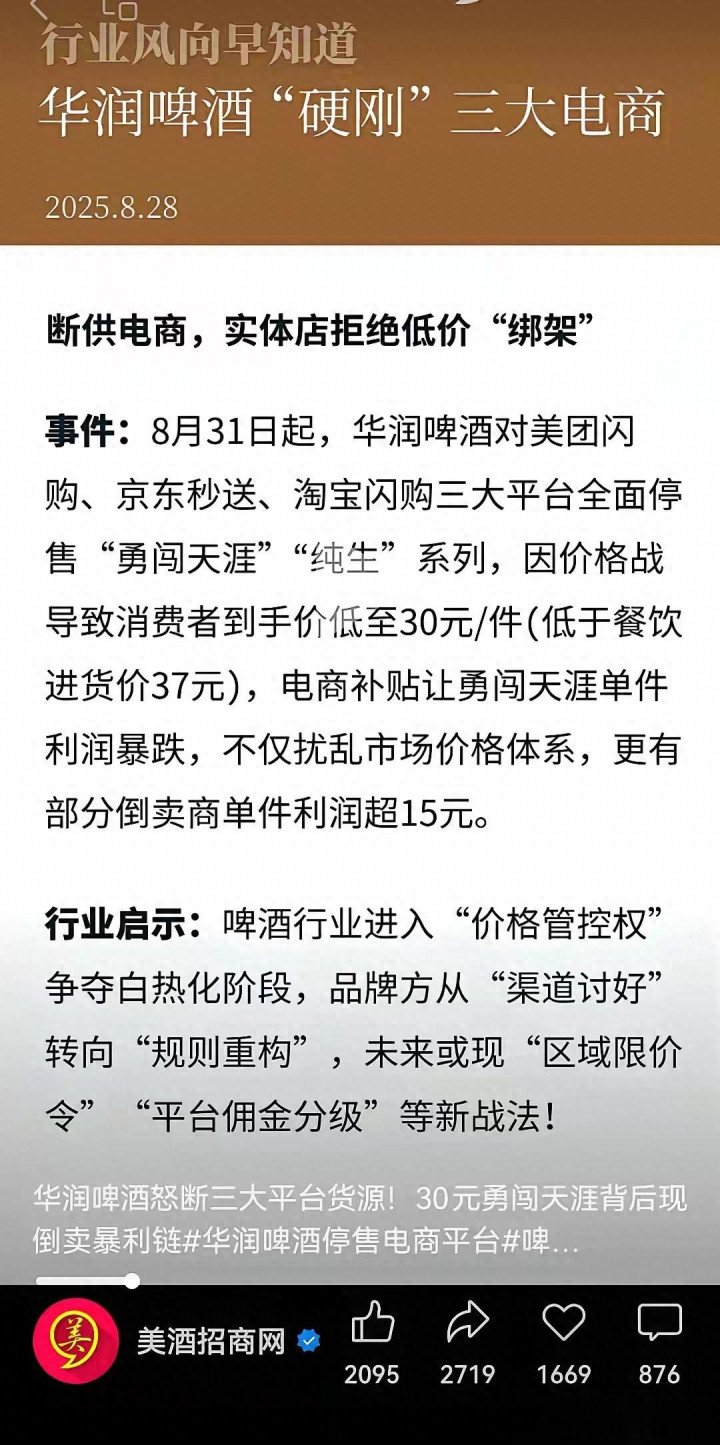 说白了,就是平台补贴战打得太凶了,线上线下价格体系都快崩了。一瓶啤酒在不同渠道卖不同价,比如“勇闯天涯”,“纯生”啤酒进货价37一件,线上30一件。电商补贴让勇闯天涯利润暴跌。经销商也叫苦连天。华润雪花这次站出来抵制,表面上是整治“乱价”,其实是在争夺定价的话语权。