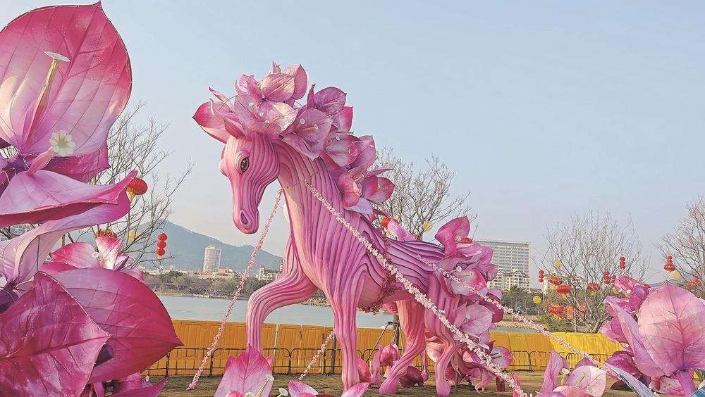 海沧金沙书院的草坪上,一匹粉红“花马”惊艳亮相。导报记者在现场看到,粉艳的花瓣缀满马身,仿佛从花海中漫步而出,温柔又灵动,国风感十足。据建设方介绍,这尊名为“马上生花”的灯组,以厦门市花三角梅为创意核心,灯组高度接近8米,搭配周围散落的“春花纳福”花灯,将闽南年味与马年吉祥寓意完美融合。正在附近遛弯的市民李阿姨停下脚步,笑着说:“我家就住这附近,每天来散步都能看见这匹花马,越看越好看,今天我带小孙子来拍照,随手拍都好看!”