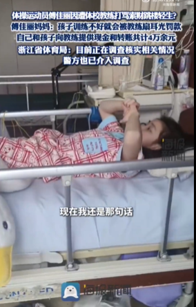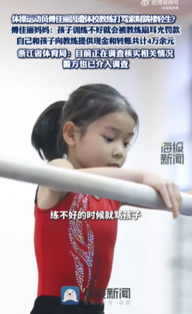 2月10日(报道),浙江杭州。体操运动员傅佳丽妈妈告诉@海报新闻 记者:“孩子训练不好就会被教练扇耳光、罚款,自己和孩子向教练提供现金和转账共计4万余元。”